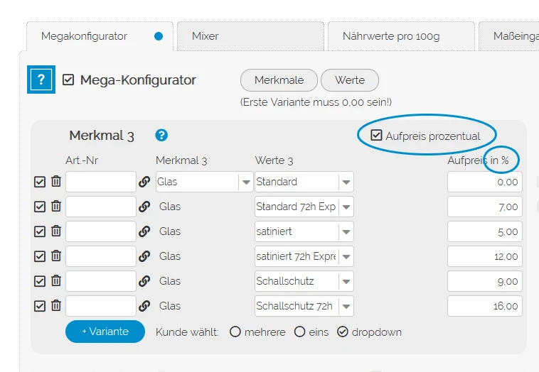 Es kann für jedes Merkmal entscheiden werden, ob die Preise als Festpreis oder prozentual auf den Variantenprei/Preismatrix aufgeschlagen werden sollen.